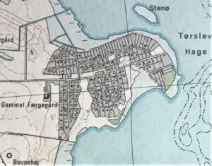 Vi kan se at området gennemskæres af en gennemgående vej, den daværende Gammel Færgegaardsvej. Alle parceller nord for denne vej er udstykket fra Stenøgaard, men efter at dette kort er trykt, kommer der til Stenøgaard endnu et sommerhusområde beliggende tættere på Tørslev. Alle parceller syd for vejen er udstykket fra Gl. Færgegaard.